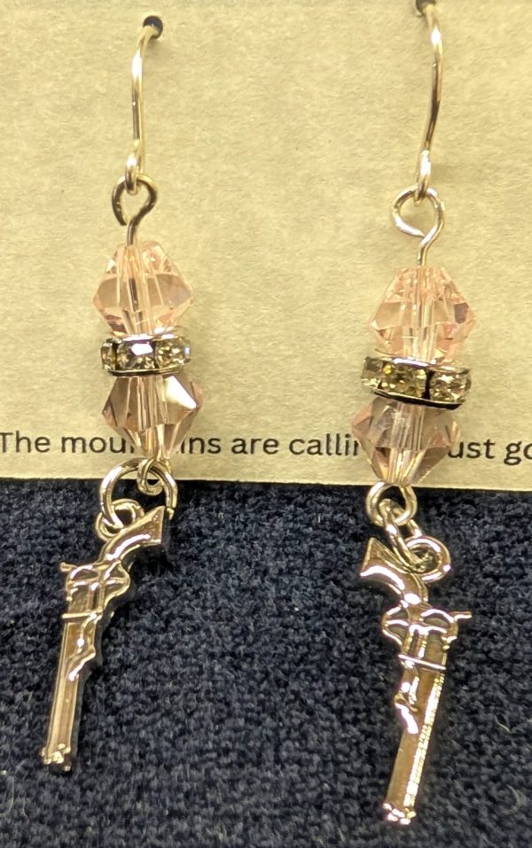 The focal point is a small silver-plated gun charm, delicately detailed for a stylish, eye-catching finish. Pink crystal beads, paired with a shimmering silver crystal rondelle, add brightness, elegance, and just the right amount of sparkle.